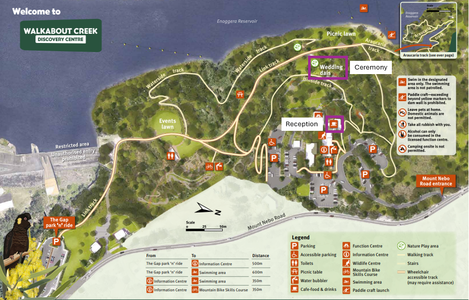 The ceremony will be taking place at the Wedding Dais which is a 500m walk along a boardwalk from the Discovery Centre. The reception will take place following the ceremony on the Deck Cafe.
